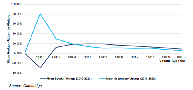In February 2024, Cliffwater conducted an analysis of secondary and traditional buyout fund performance to demonstrate the secondaries n-curve with real-world data. A comparison of secondaries and buyout vintages from 2010–2022 showed a median IRR of 80% for secondary funds in the first year compared to almost -30% for private equity buyouts.