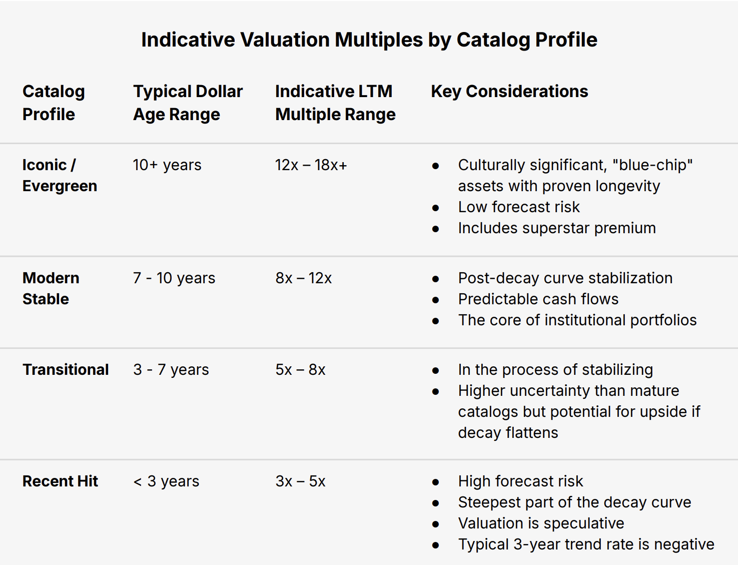Newer Catalogs: Dollar Age under 3 years and highly speculative, as long-term earnings potential is unproven. They trade at the lowest multiples, often 3x–5x LTM or NPS, to compensate investors for the uncertainty in their future decay curve. 25