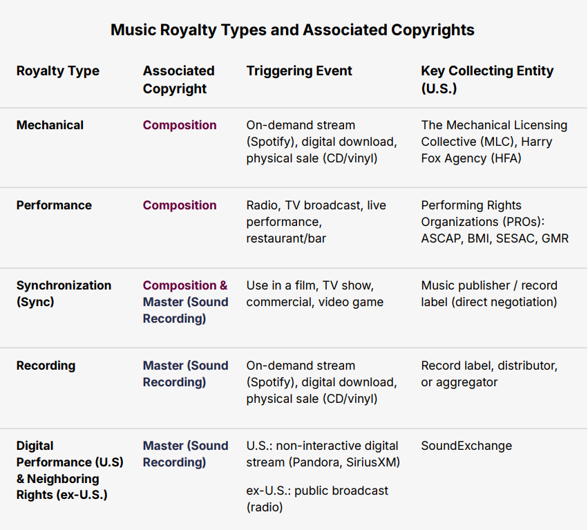 The two copyrights generate five main types of royalties, triggered by music consumption: